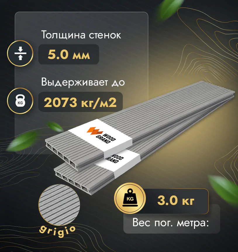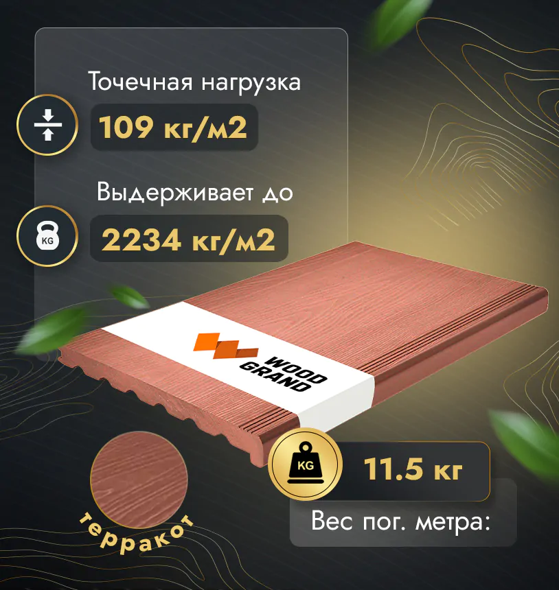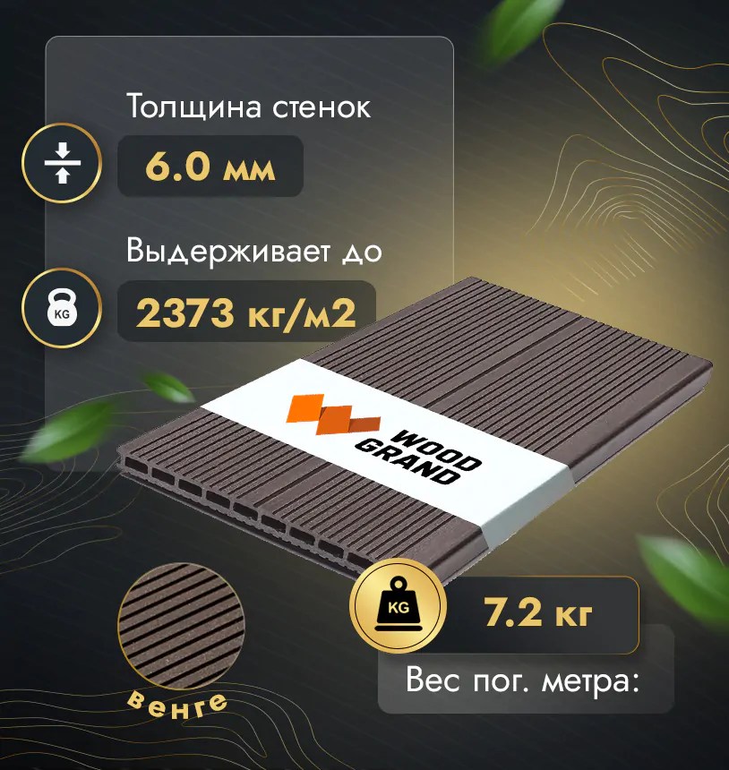 Наша террасная доска из МПК выдерживает до 3318 кг/м2, влагостойкая, не требует ухода.